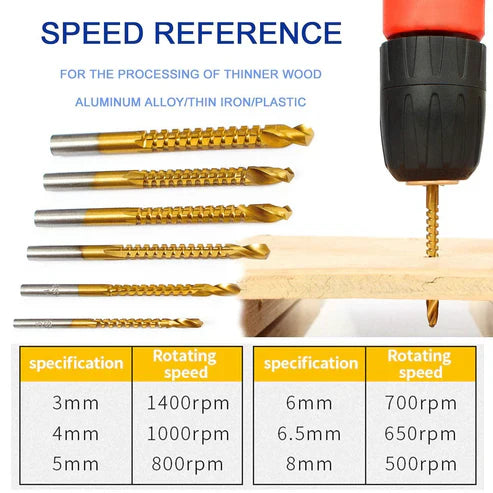 están hechos de material HSS con revestimiento de titanio, borde de cuerpo de las brocas afilado, más rápido con menos esfuerzo. El diseño de ranura en espiral totalmente molida disminuye rápidamente la fricción y el calor para un rendimiento de perforación más rápido y fresco.
